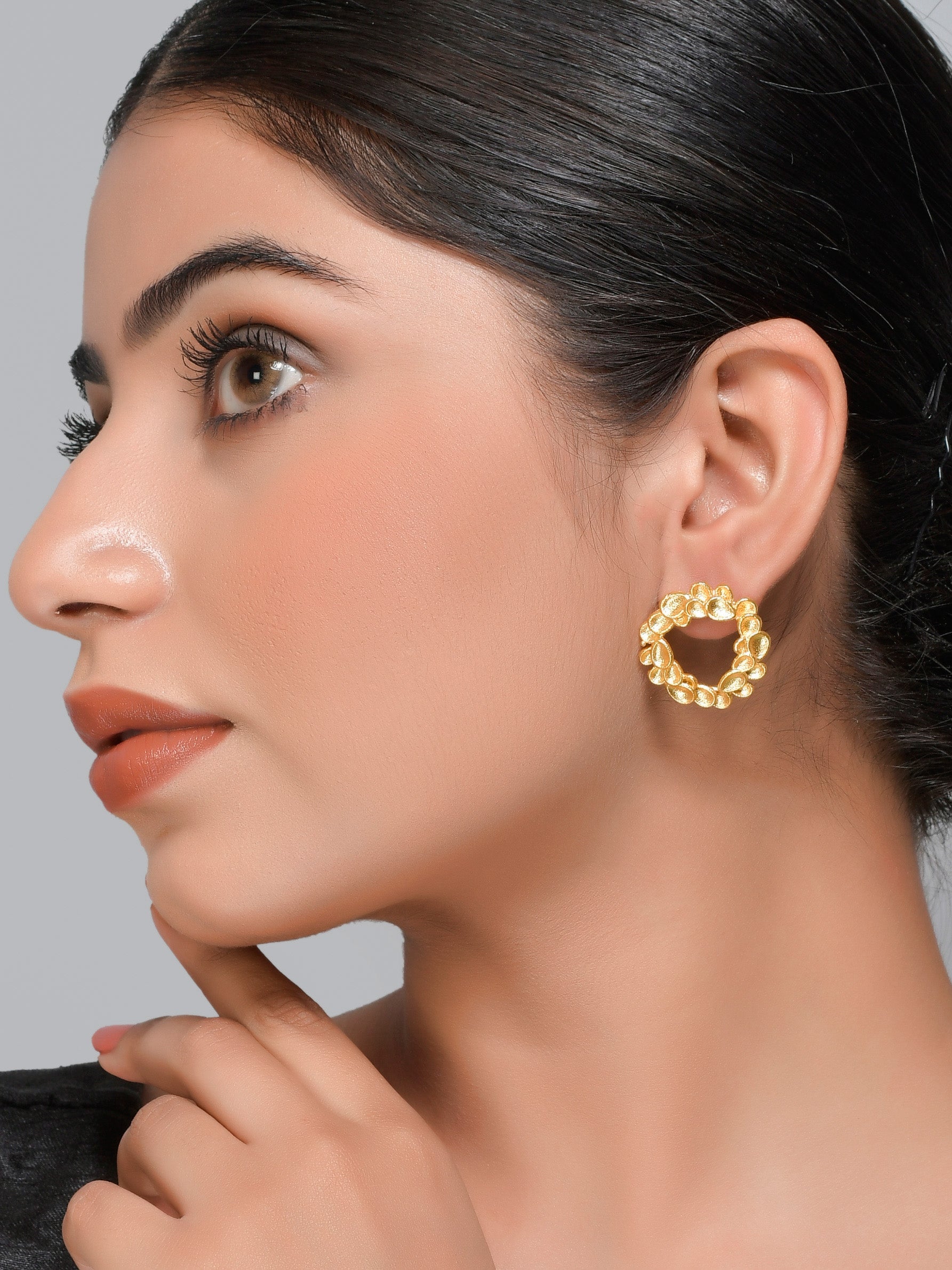These gold plated designer circular earrings add a touch of elegance to your look. The design is lightweight and comfortable to wear, making them a perfect everyday accessory. They are crafted from a durable gold plated metal and have a luxurious glossy finish. Add a splash of sparkle to your ensemble with these classic, timeless earrings!