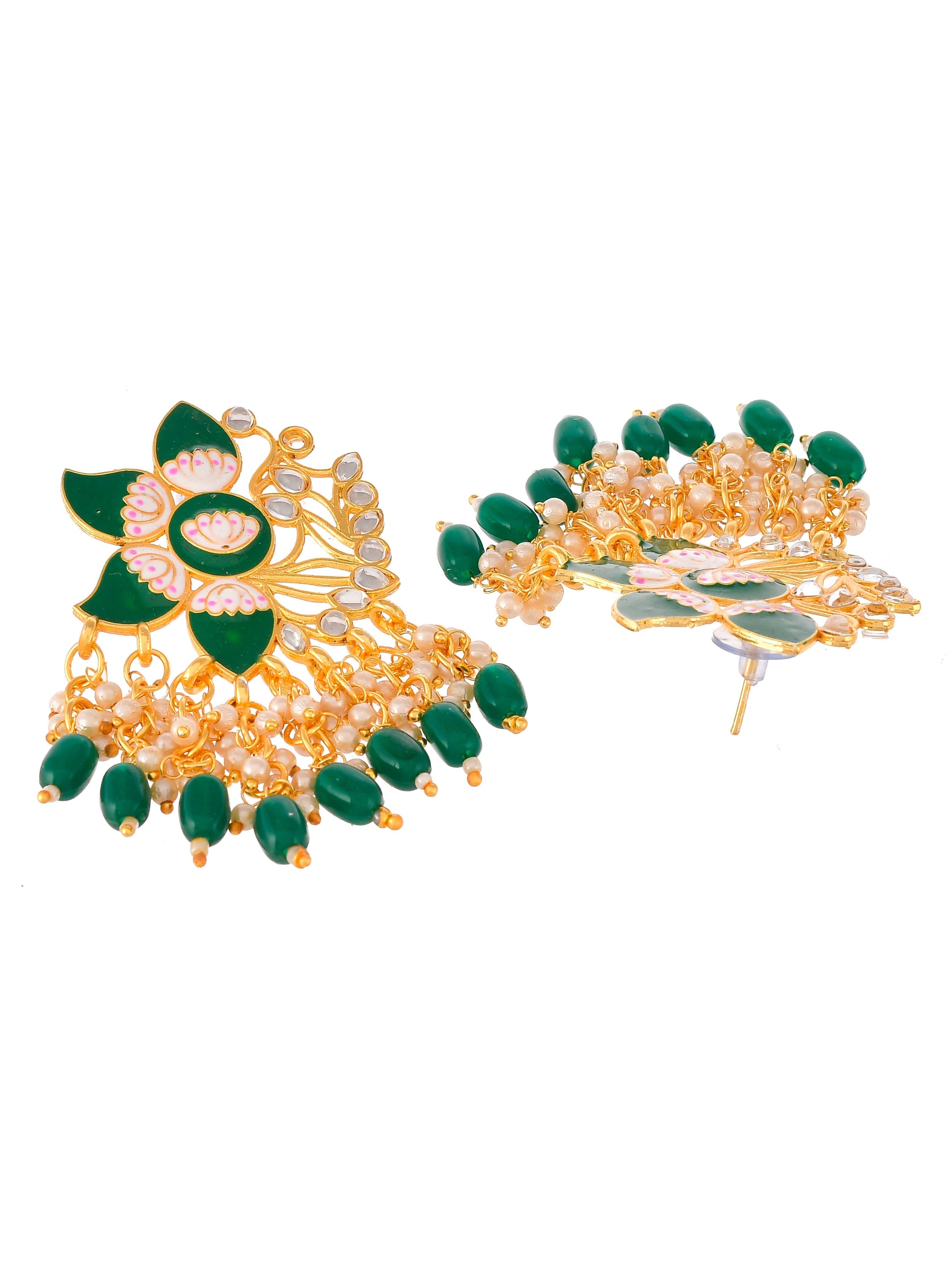 Gold Plated Green Toned Handcrafted Kundan Studded Floral Drop Earrings
