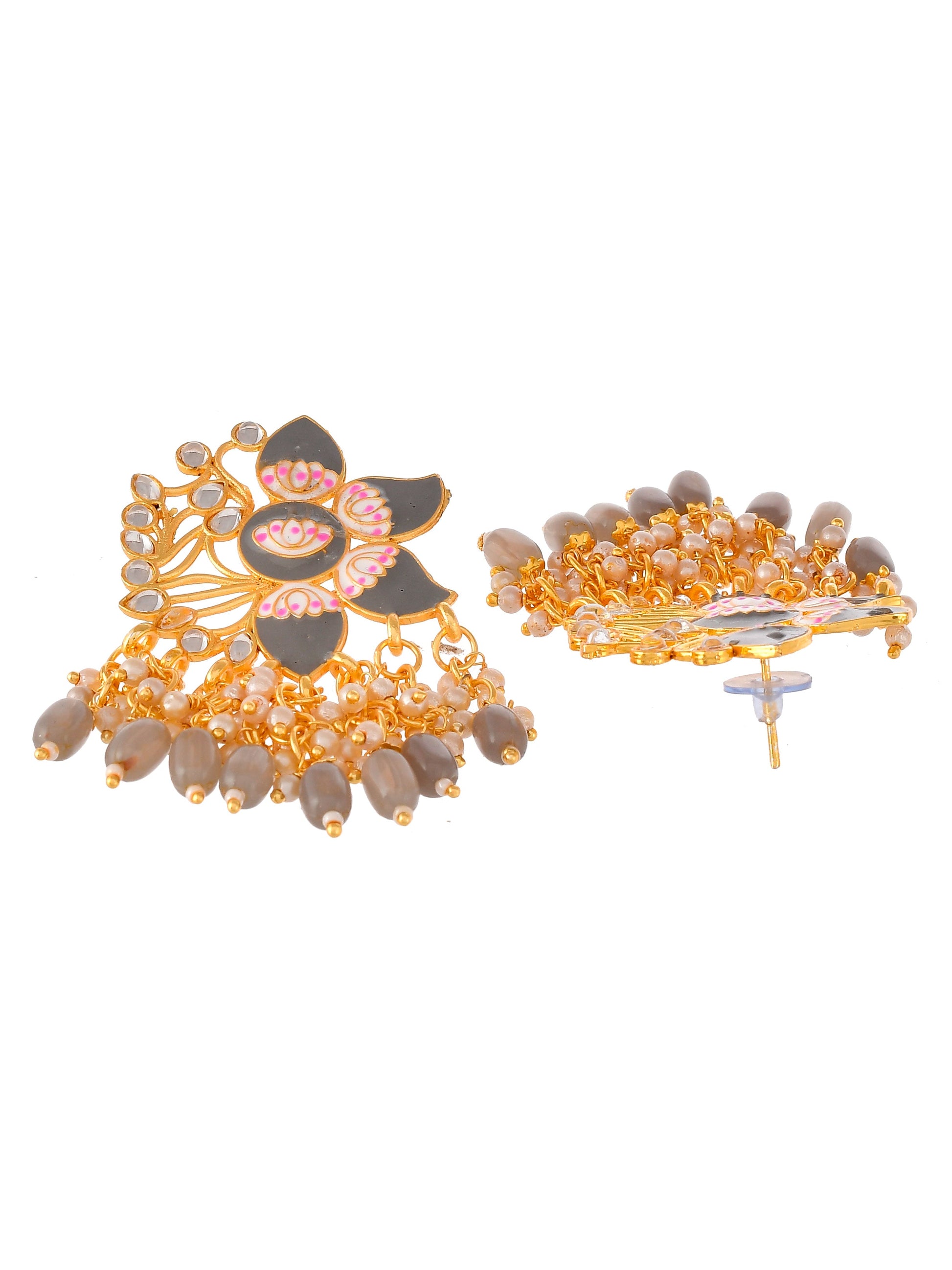 Gold Plated Grey Handcrafted Kundan Studded Floral Drop Earrings