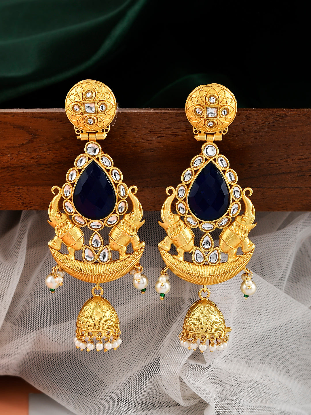 Long dangler earrings are gold finished and embellished with pearls. The peacock blue stone adds to the beauty of the stylish earrings. The triumphant elephant below the stone adds to the glory of temple jewellery.