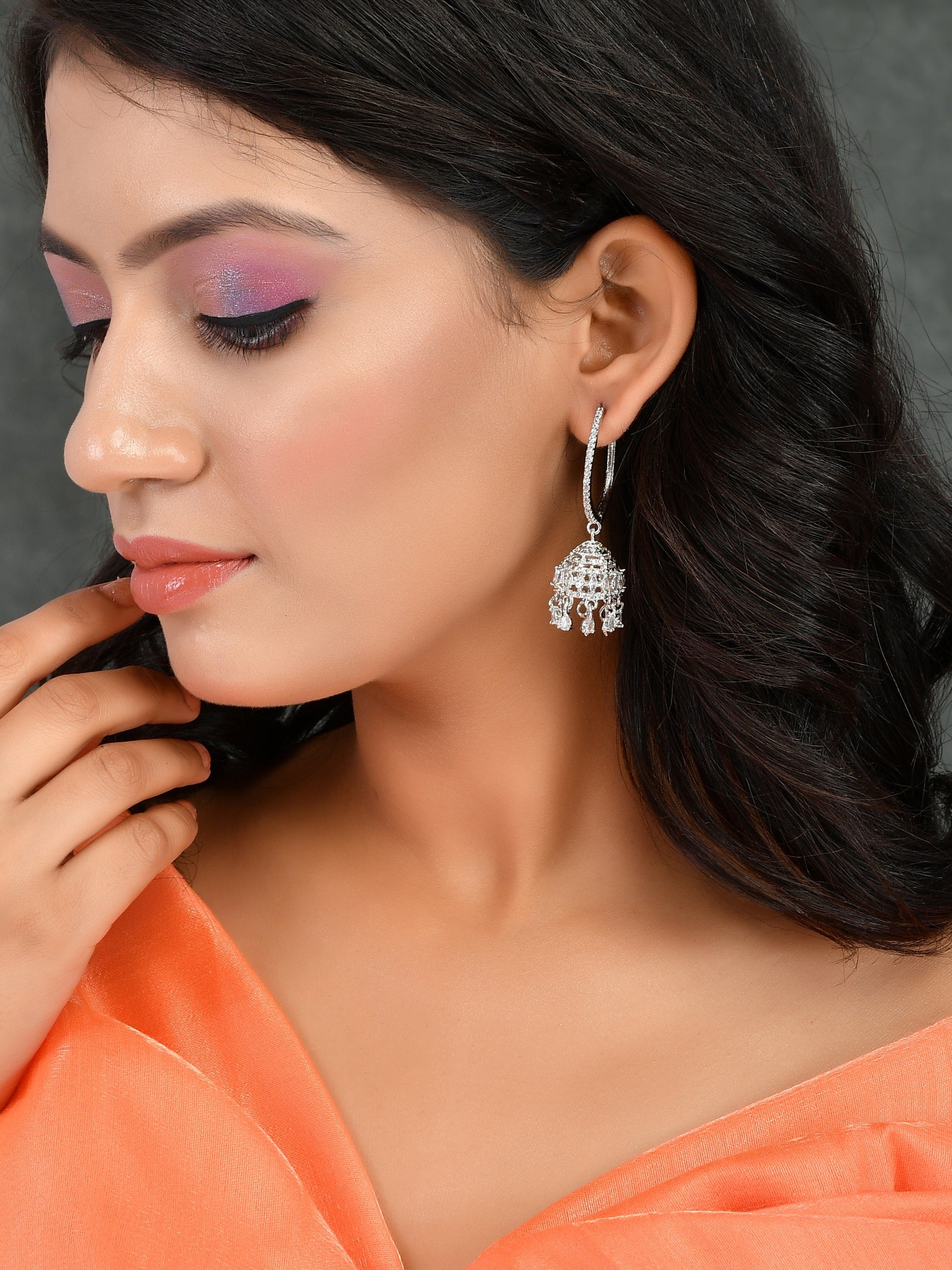 Shop these beautiful Silver plated AD jhumki earrings are a type of earrings that feature silver-plated metal and American diamonds (also known as cubic zirconia) in a jhumki style.