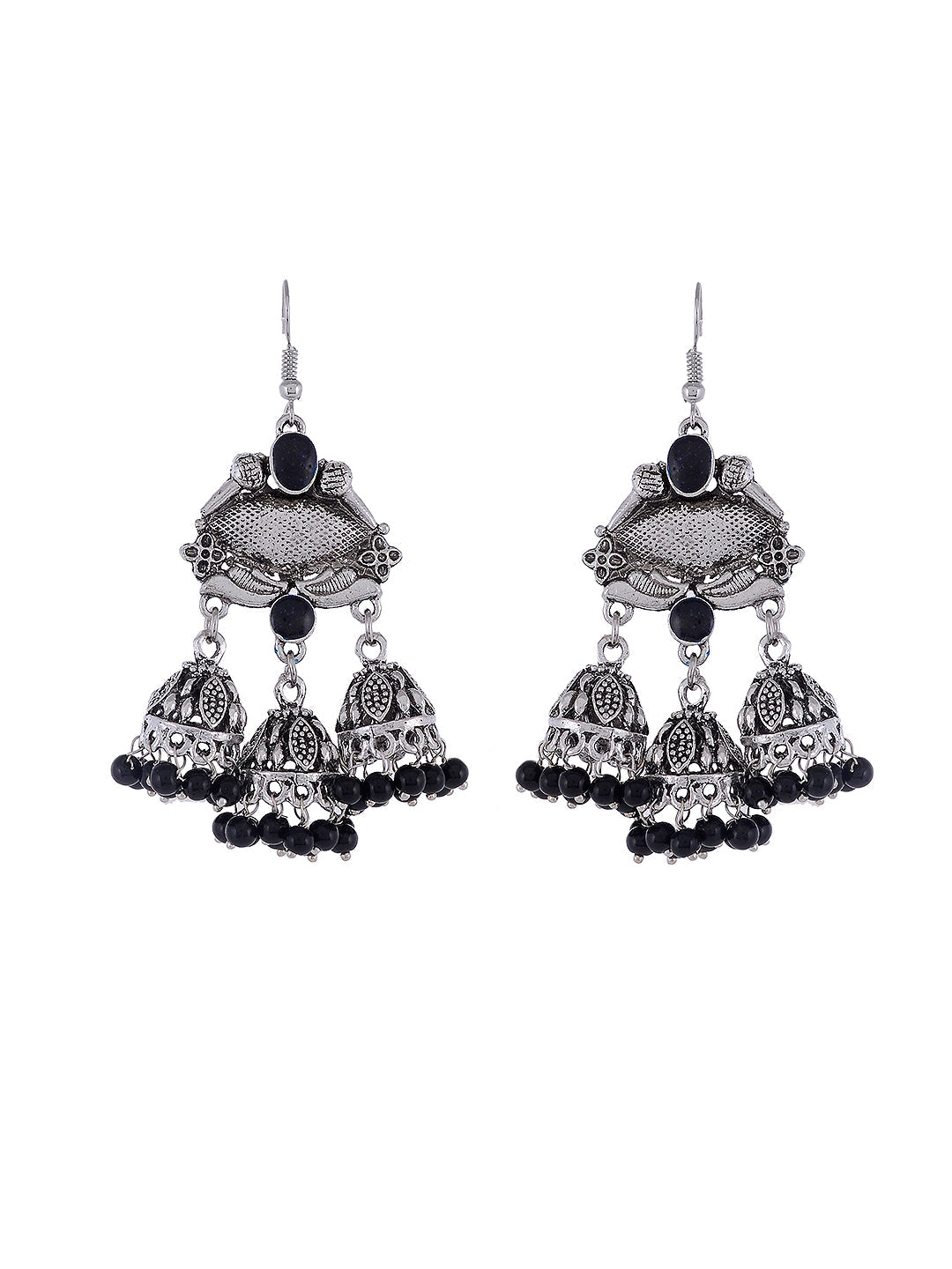 These stylish Silver Plated & Black Dome Oxidised Shaped Jhumkas will add a modern touch to your look. Crafted from quality material, these jhumkas are sure to last for a long time. With a sophisticated black dome oxidised finish, these earrings are perfect for both traditional and contemporary wear.