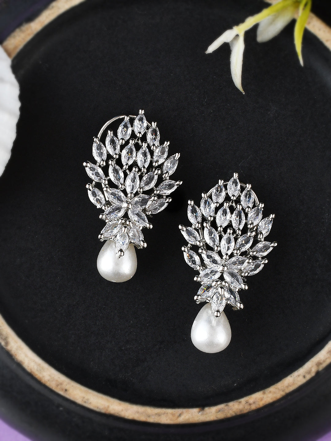 Silver-toned contemporary drop earrings, silver-plated, has american diamond